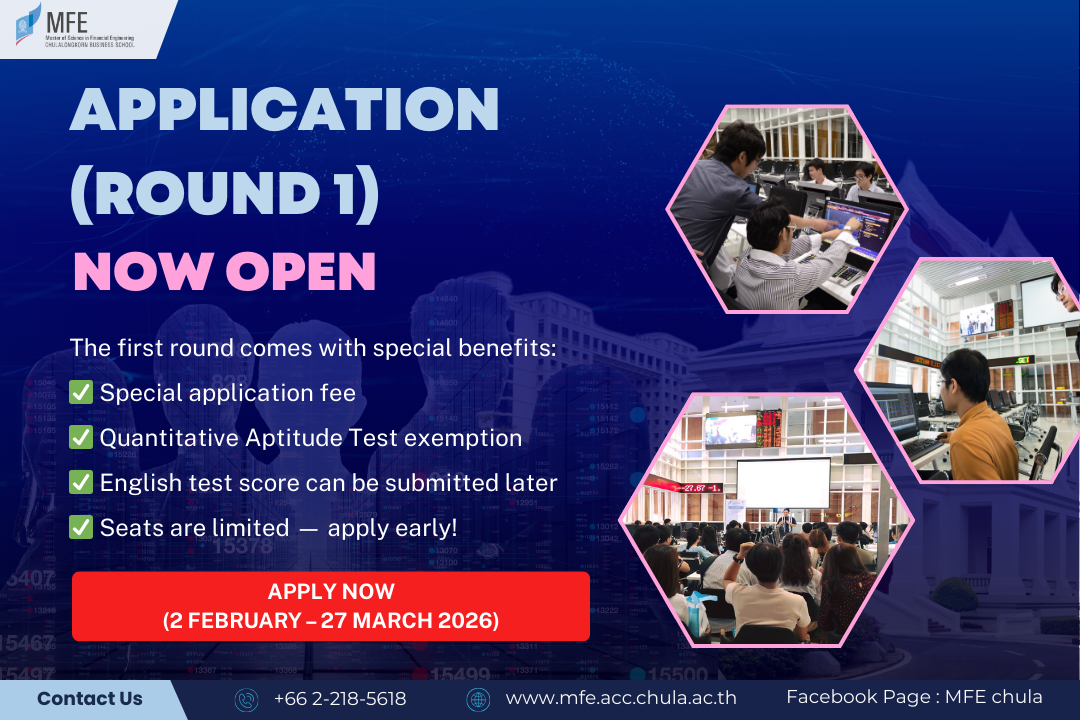 Dreaming of a career in Quantitative Finance, Risk Management, or FinTech? The Master’s Program in Financial Engineering (MFE) at Chulalongkorn University is now accepting applications for Round 1.